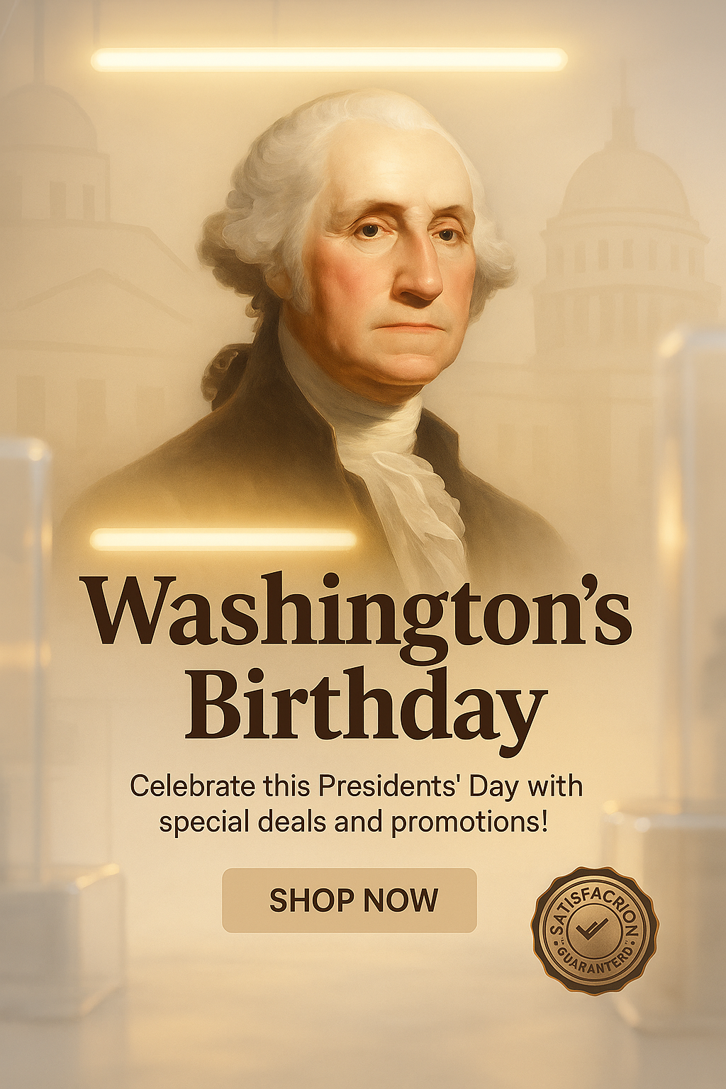 /Collection: /by davooda/Type: PNG/Promotional banner celebrating Presidents' Day with a portrait of George Washington. The design features soft lighting and a modern aesthetic, ideal for holiday marketing campaigns.
