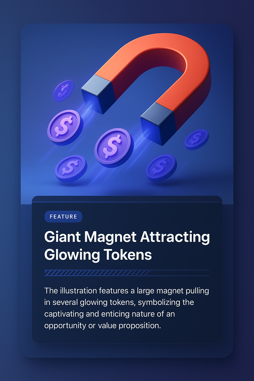 A vibrant 3D illustration of a giant magnet attracting glowing tokens, symbolizing opportunity. The visual features a smooth gradient background and layered design elements.