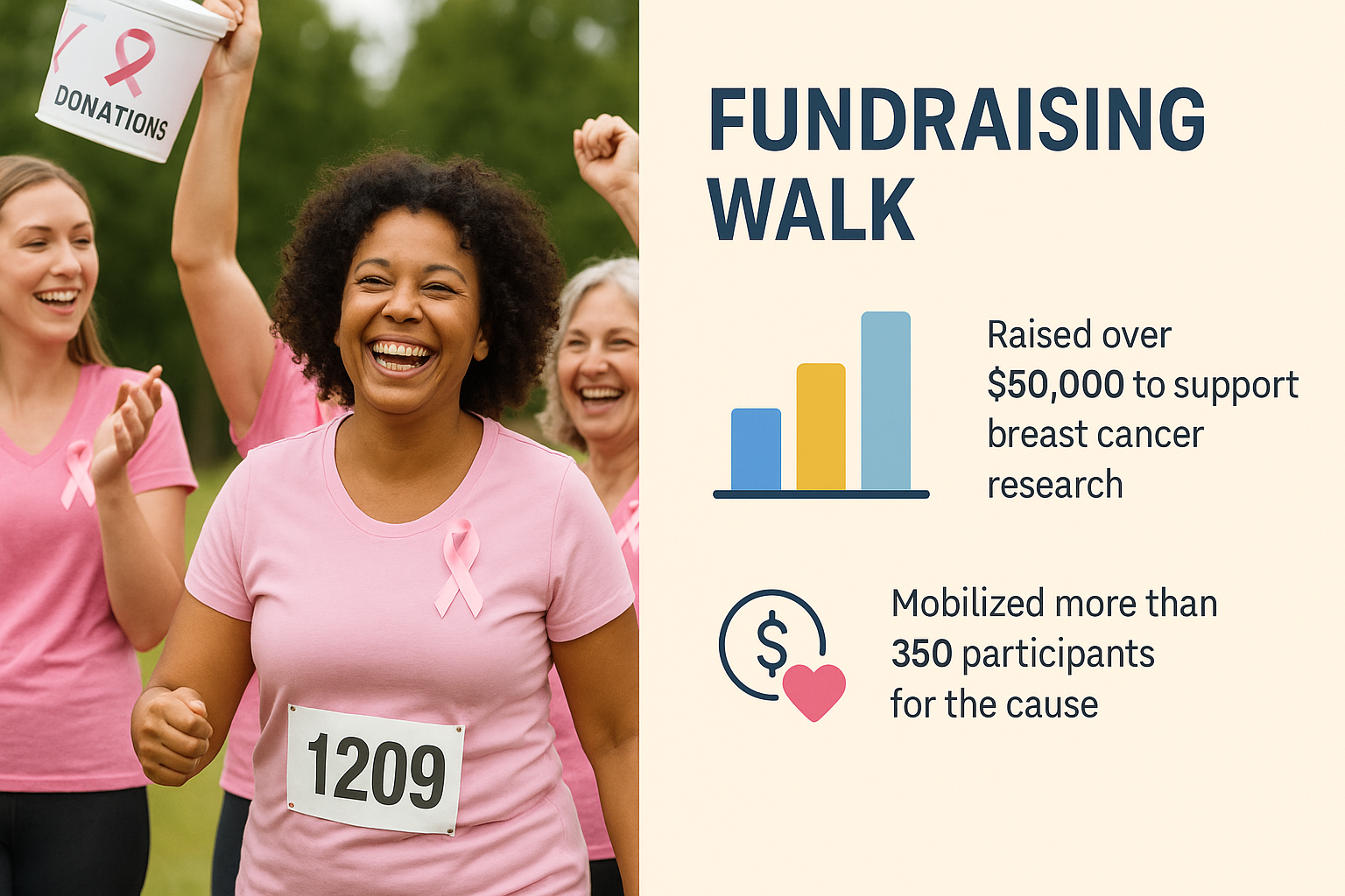 /Collection: /by davooda/Type: PNG/Promotional image depicting a joyful group of participants in a fundraising walk for breast cancer research, showcasing community support and fundraising efforts.