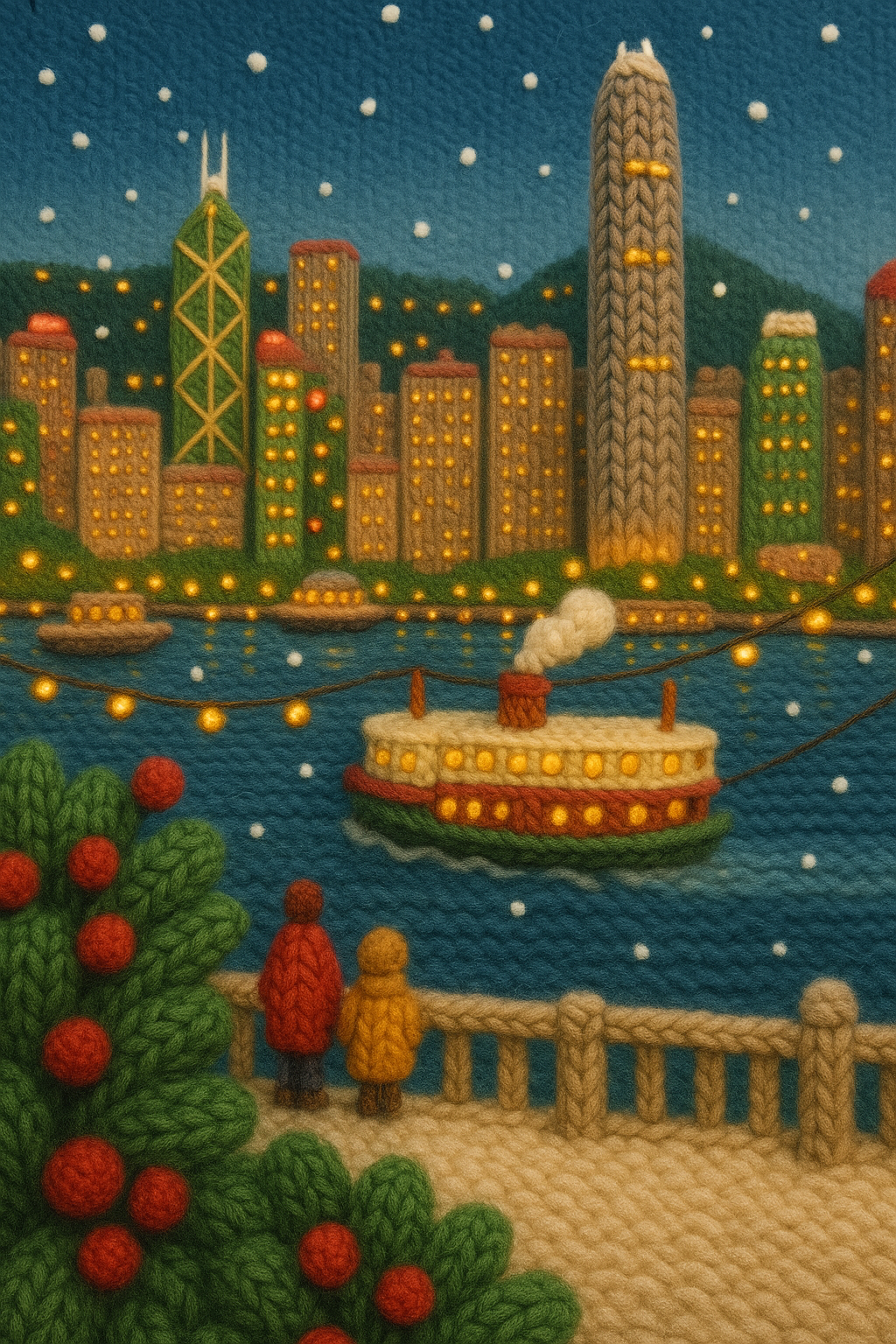 A whimsical winter harbor scene depicting Victoria Harbour, Hong Kong, crafted in a textured knit style. The image features colorful buildings, soft snow, and tiny figures enjoying the festive atmosphere.