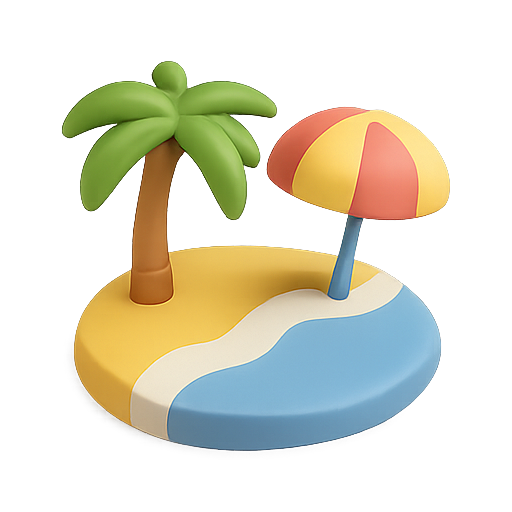 A 3D illustration depicting a tropical beach scene with a palm tree and a colorful beach umbrella. This playful design is suitable for summer-themed projects or vacation promotions.