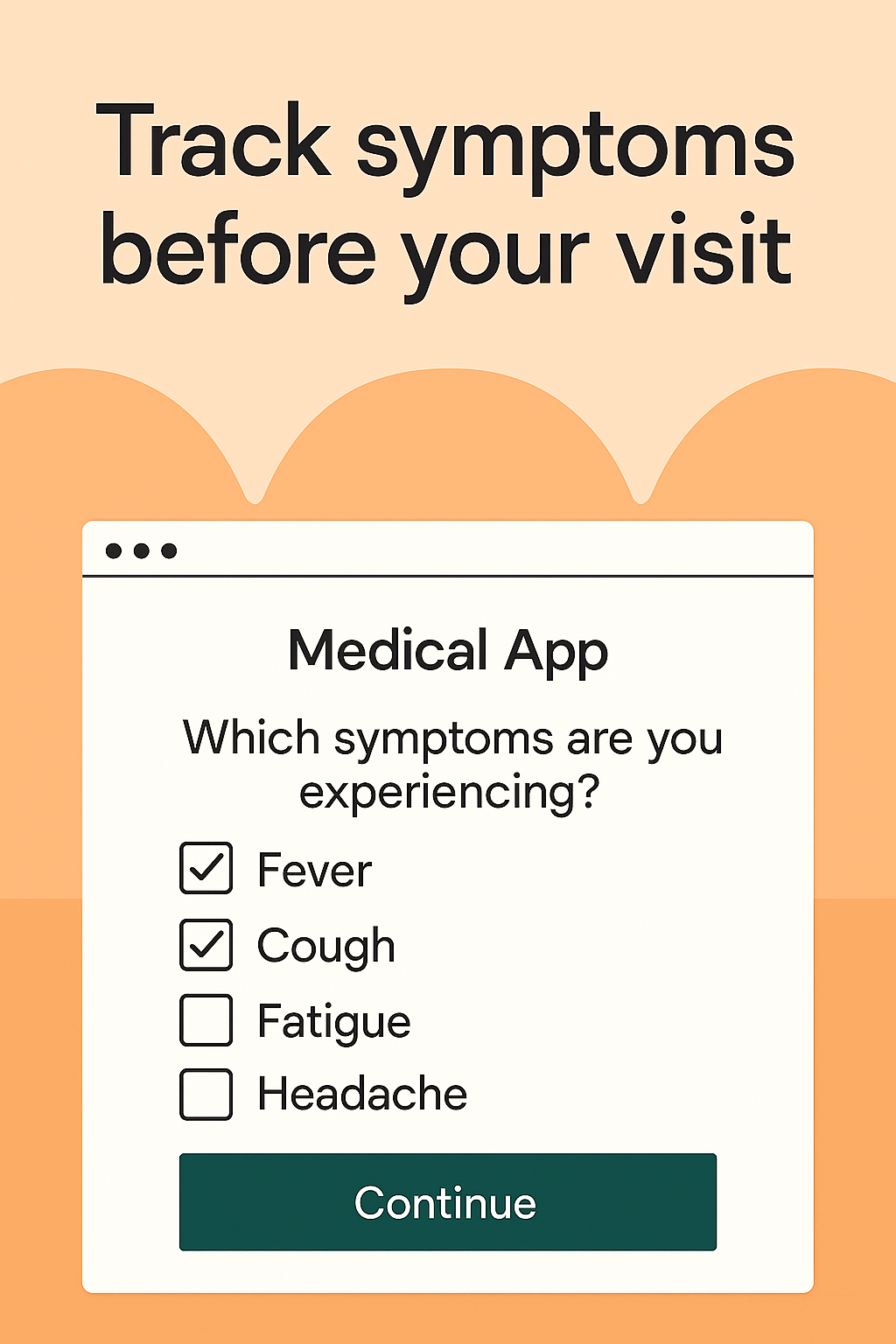 User interface mockup for a medical app, showcasing a symptom tracking feature. The design is clean and user-friendly, ideal for healthcare applications.