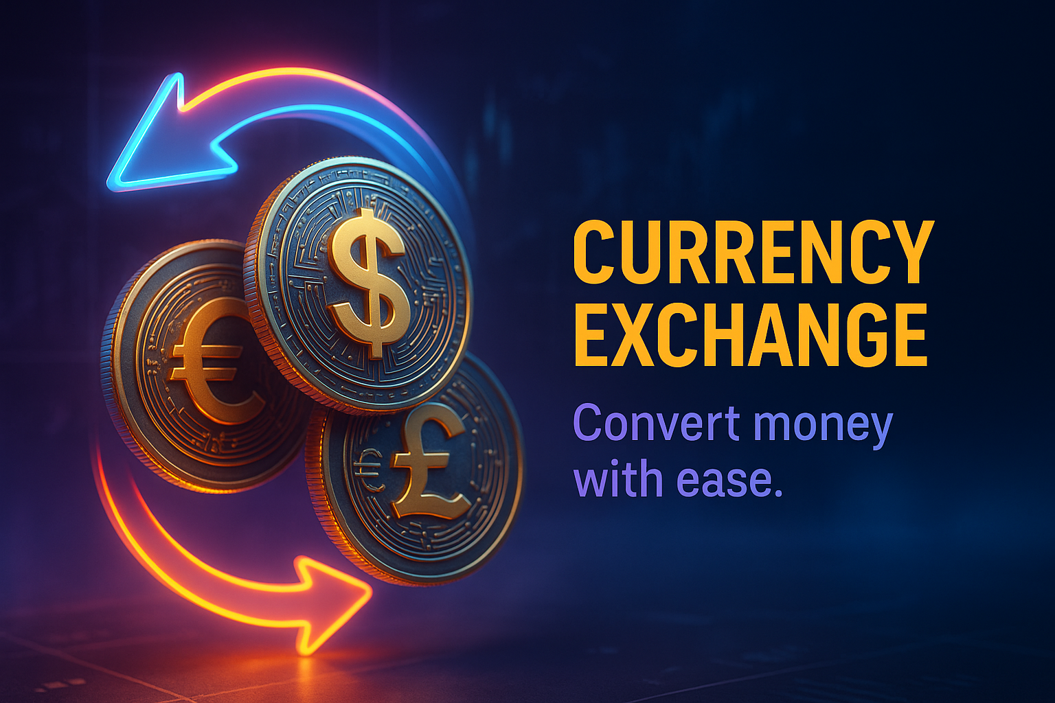 Currency Management Promotional Graphic Featuring Coins and Exchange Arrows
