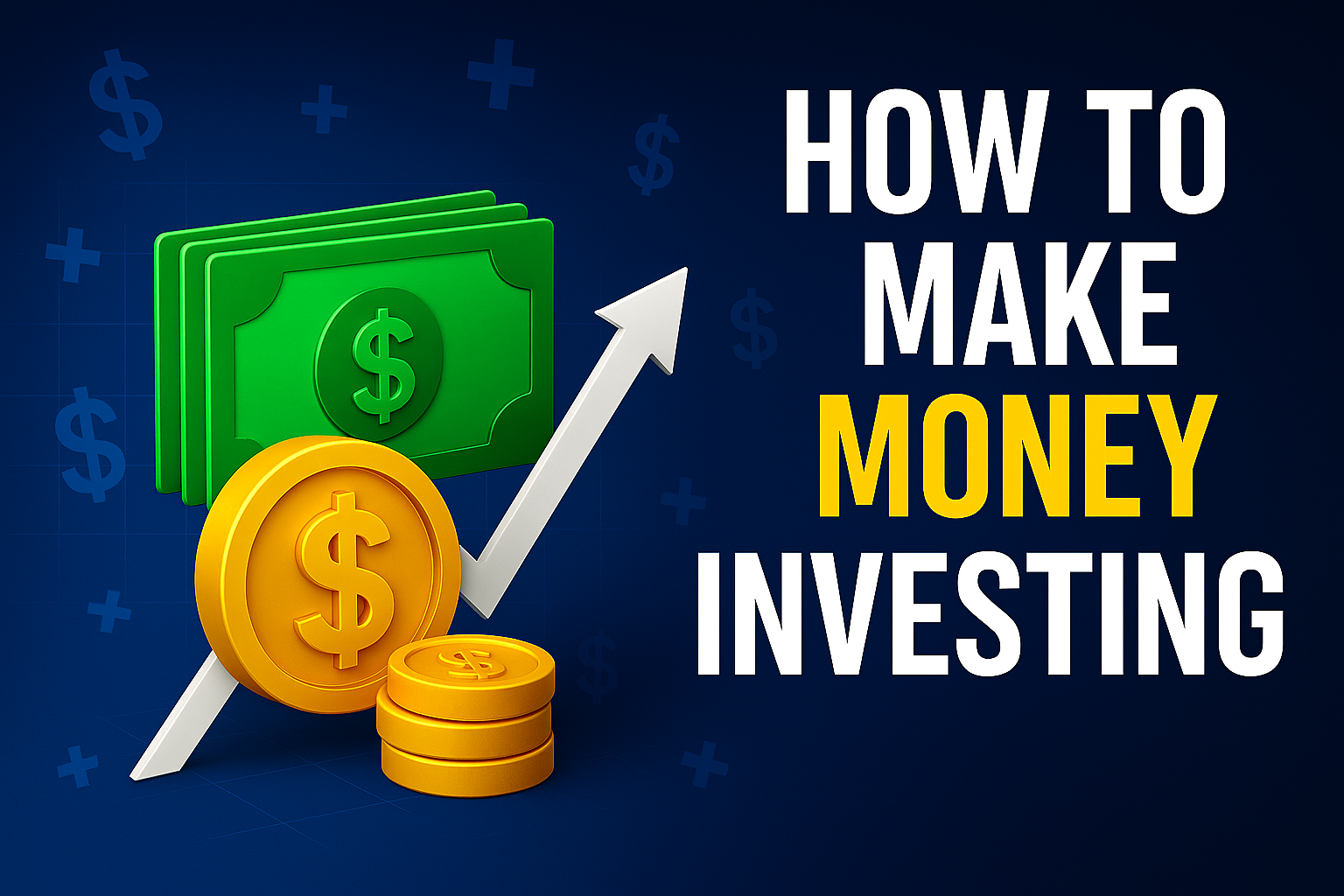 Vibrant graphic illustrating money and investment growth, ideal for financial education content. Features bold typography and 3D design elements to attract attention.
