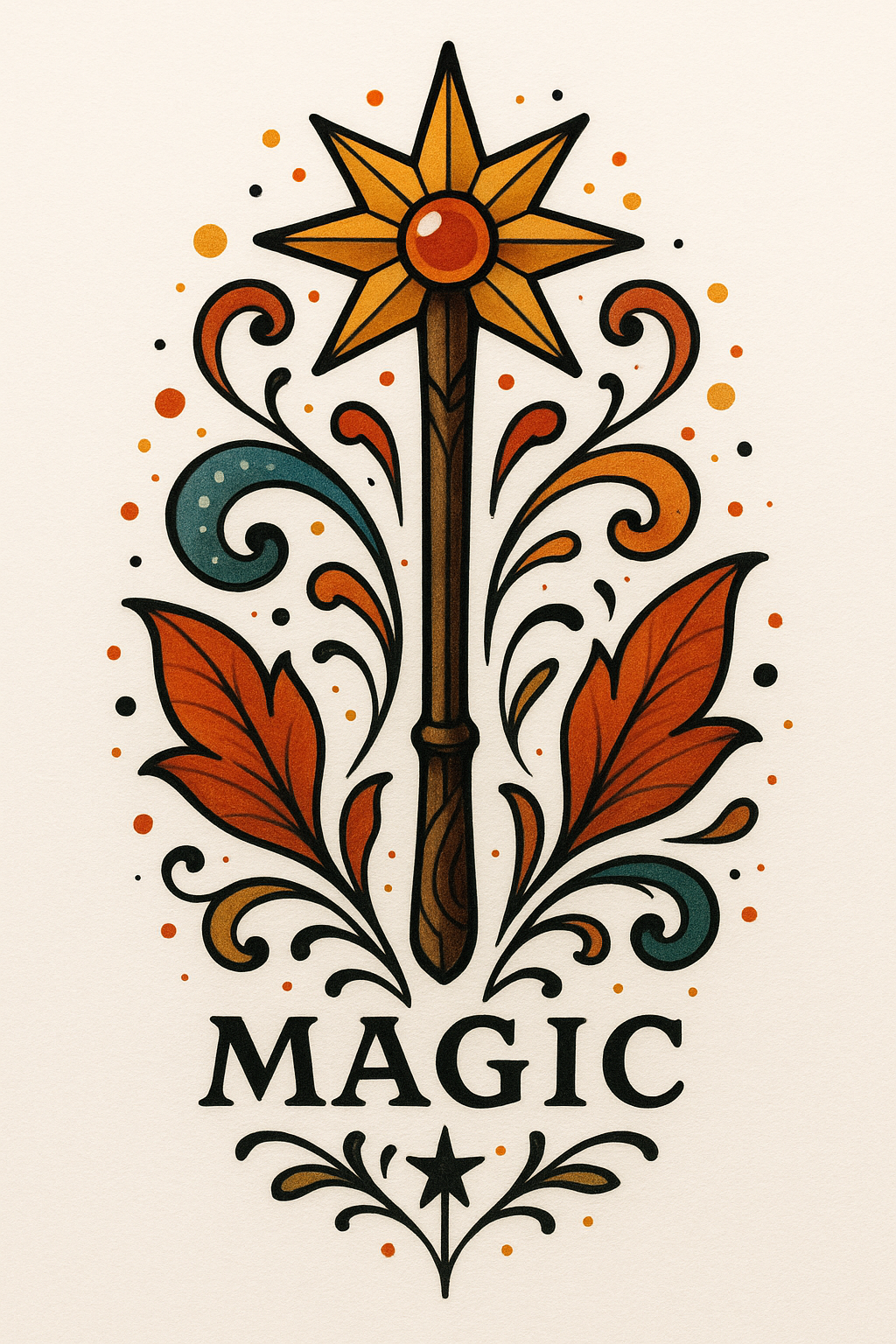 /Collection: /by davooda/Type: PNG/A vibrant illustration of a magic wand surrounded by decorative floral motifs, ideal for fantasy-themed projects or merchandise. The design features a star atop the wand, with intricate swirls and leaves in rich colors.
