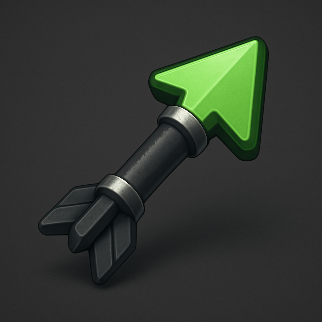 A detailed 3D arrow icon designed for gaming, featuring a sleek green arrowhead and a dark gray shaft. The icon is set against a dark gray background, enhancing its vibrant colors.