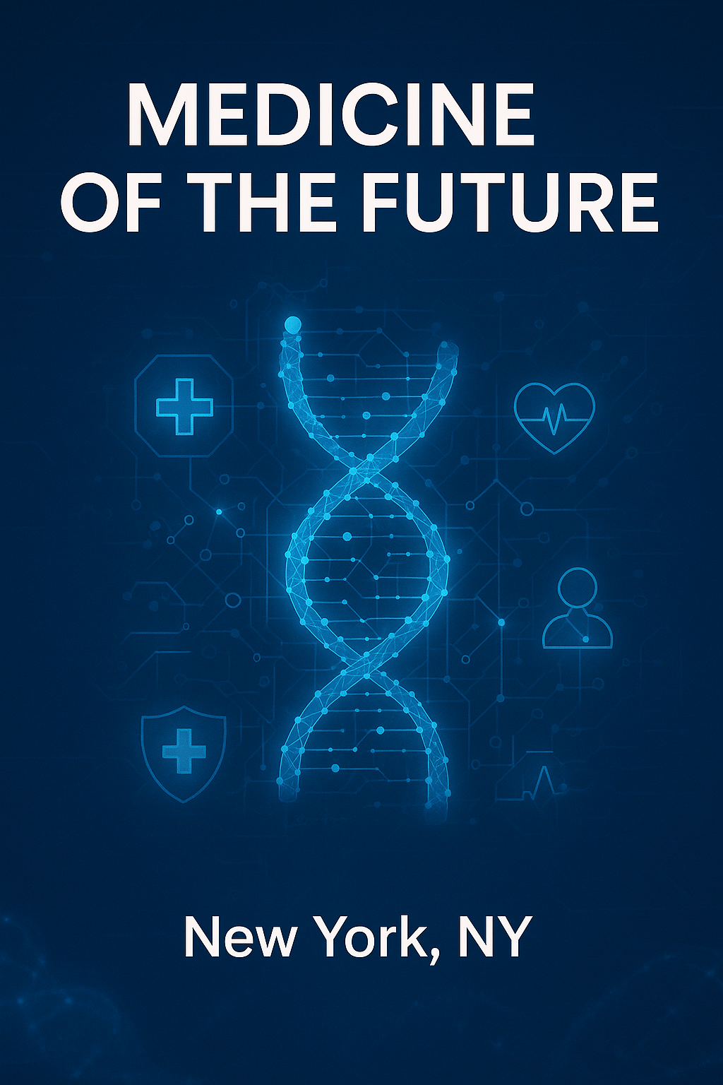 /Collection: /by davooda/Type: PNG/Promotional poster for a conference on future medicine, featuring a digital DNA helix graphic against a dark background, ideal for healthcare and technology audiences.