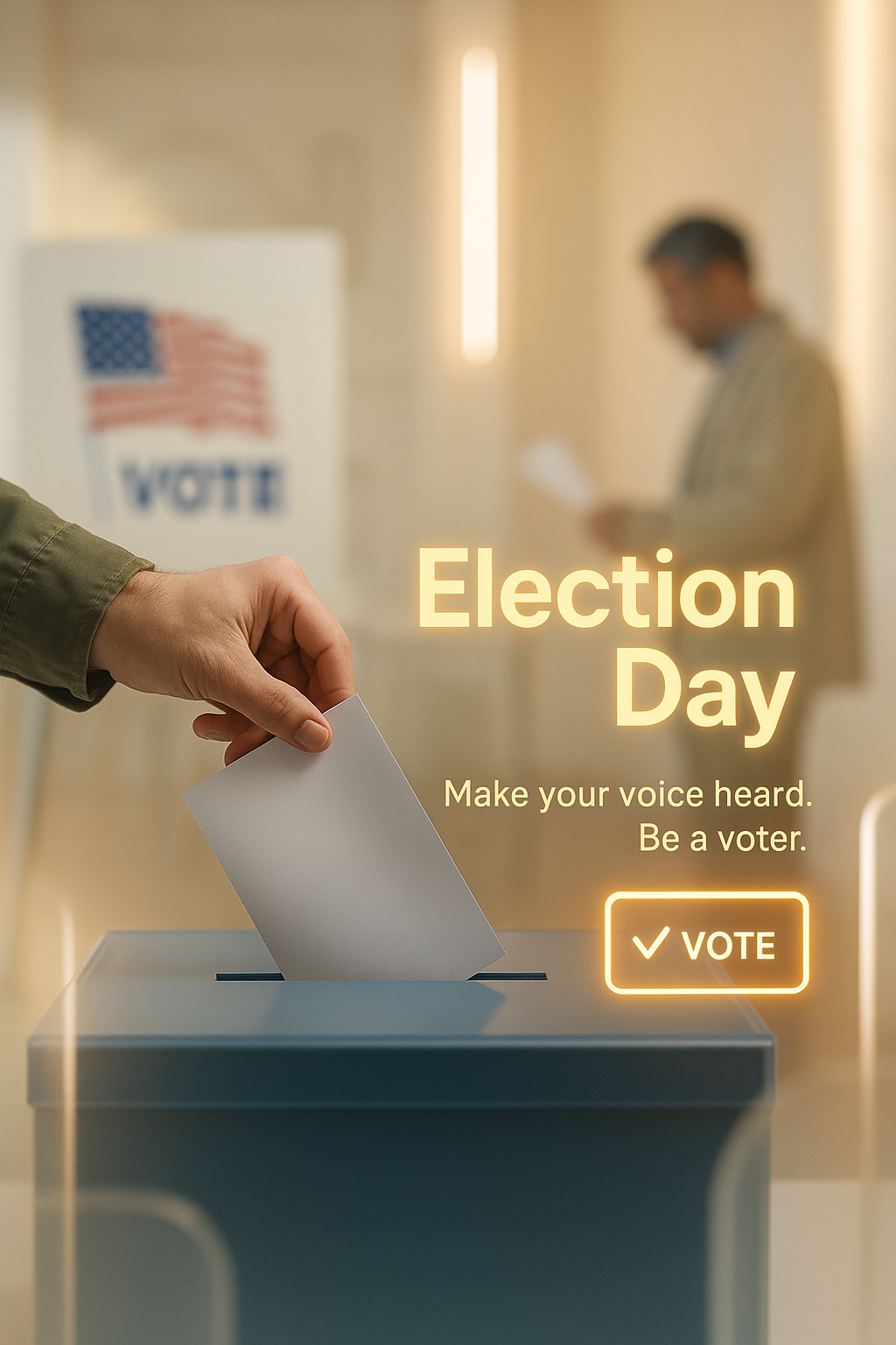 Engaging graphic promoting voter participation on Election Day, featuring a hand placing a ballot into a box with a soft-focus background, ideal for social media campaigns.