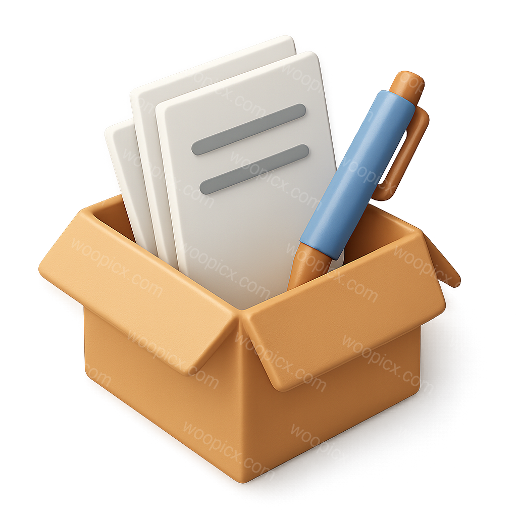 A 3D isometric icon depicting an open box containing documents and a pen, showcasing a clean and modern design with a transparent background.