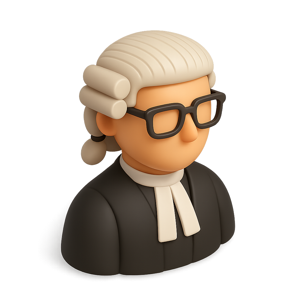A stylized 3D icon of a barrister, showcasing a figure with glasses and traditional wig in a three-quarter isometric view. The design features a soft, volumetric style against a blurred background.