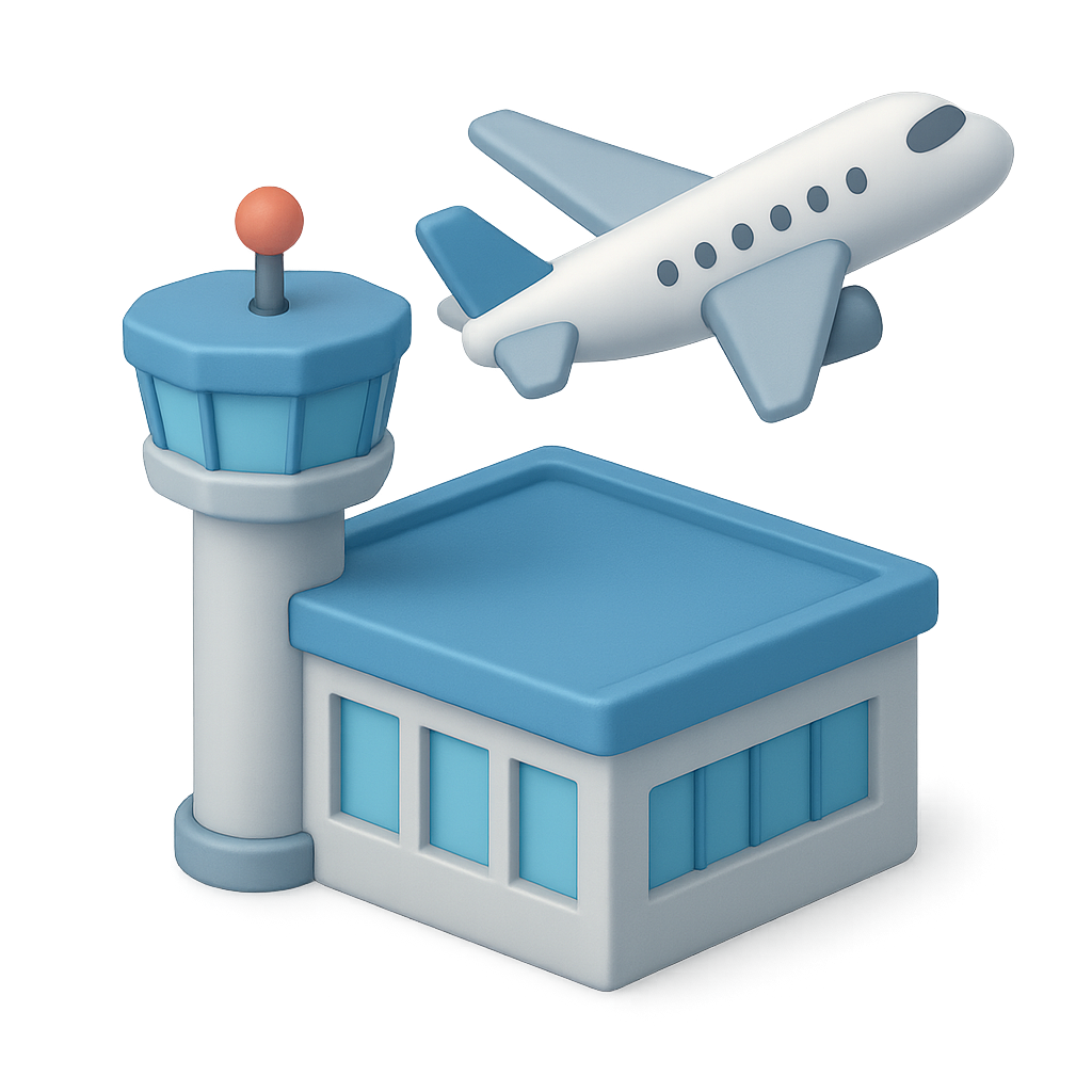 Stylized 3D Airport Icon with Control Tower and Airplane