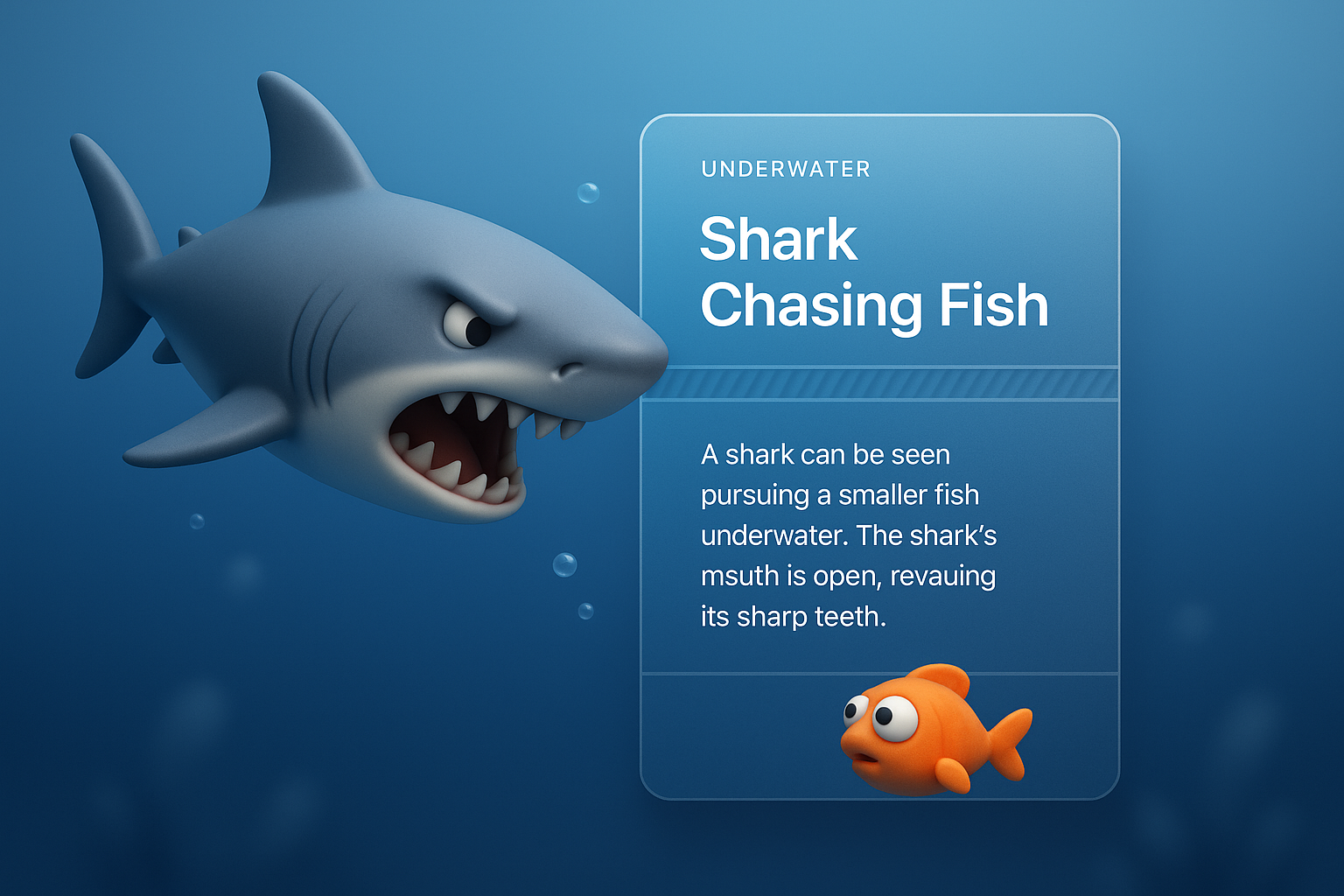 A 3D illustration of a fierce shark chasing a smaller fish underwater, featuring a gradient blue background. The shark's mouth is open, showcasing its sharp teeth, while the fish appears startled.
