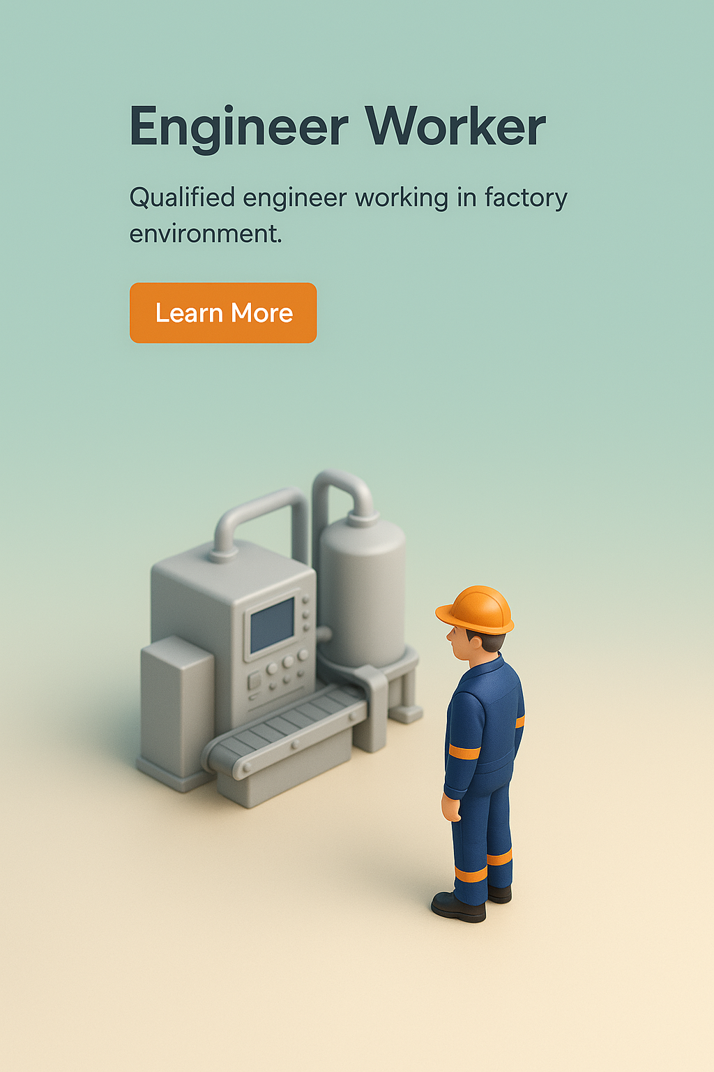 /Collection: /by davooda/Type: PNG/A 3D scene depicting a professional engineer in a factory setting. The engineer, wearing a uniform and helmet, stands beside industrial equipment, with a smooth gradient background that enhances the visual appeal.