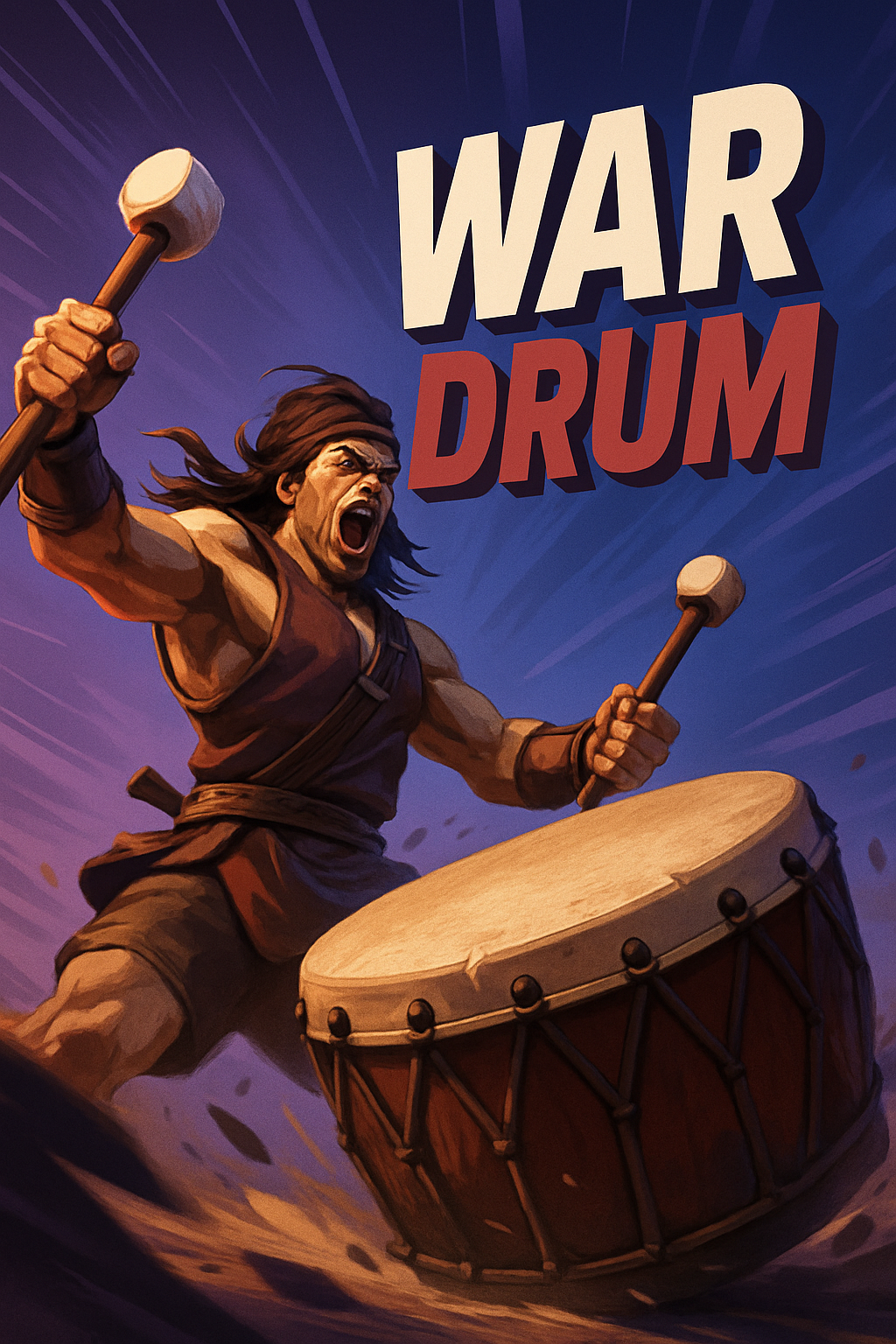 An intense illustration featuring a warrior passionately playing a war drum. The background showcases dynamic rays and a smooth gradient, creating a powerful atmosphere.