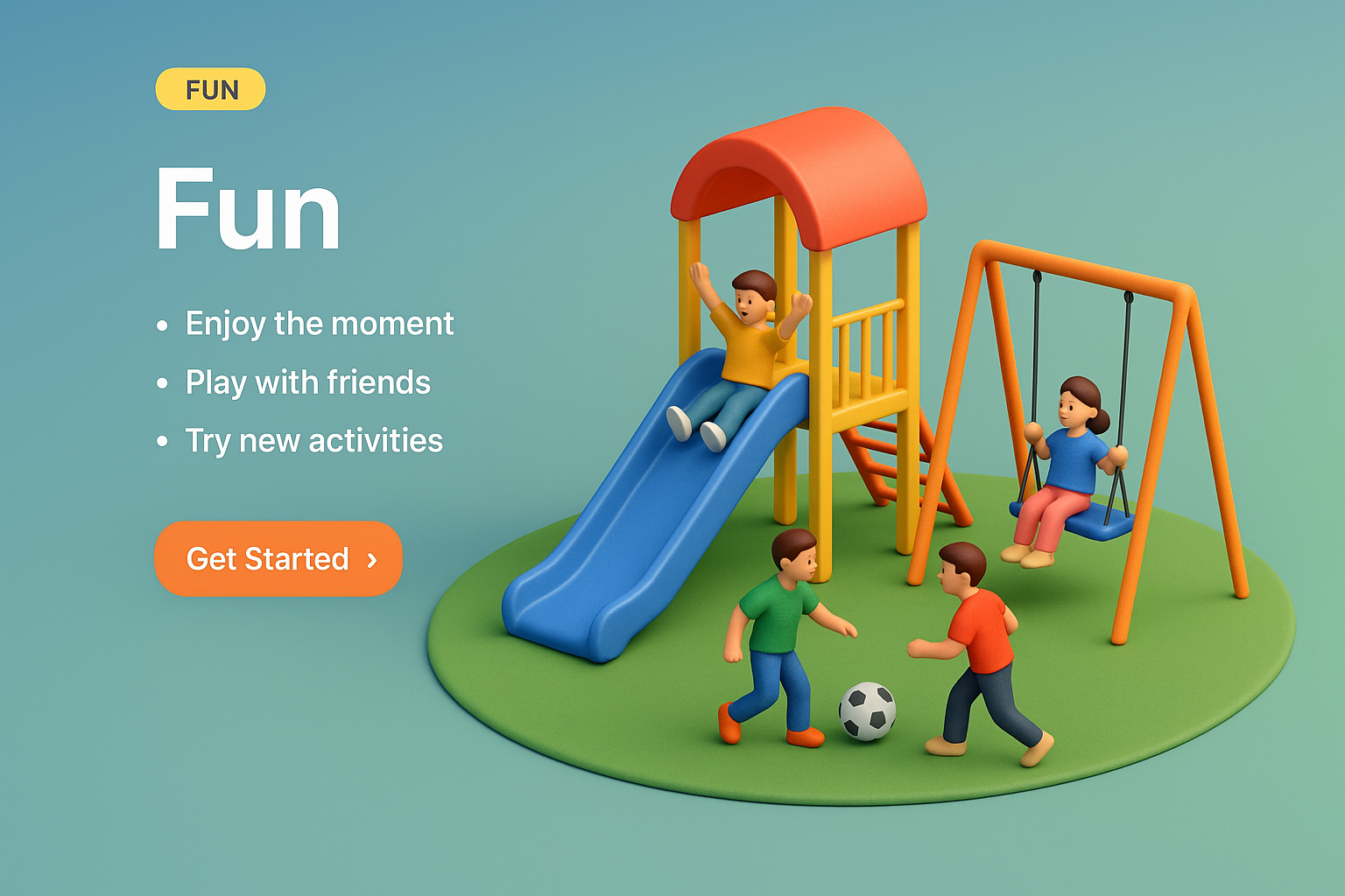 /Collection: /by davooda/Type: PNG/A vibrant 3D illustration depicting children enjoying a playground with a slide, swings, and a soccer ball, emphasizing fun and friendship in a lively environment.