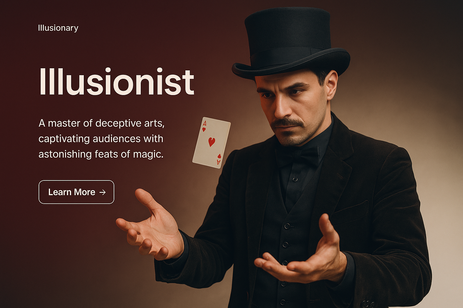 /Collection: /by davooda/Type: PNG/A stylish web page design featuring a magician performing a card trick. The layout includes a gradient background, small labels, and a clear call-to-action button.