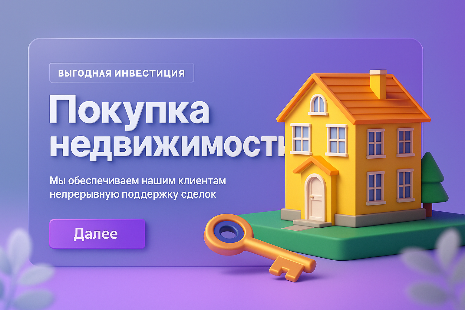 A vibrant 3D illustration showcasing a house and key against a smooth gradient background, highlighting real estate investment opportunities with clear, readable text.