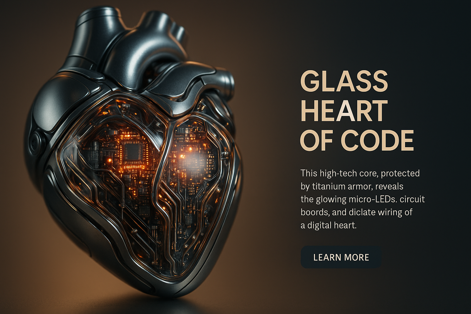 /Collection: /by davooda/Type: PNG/A hyperrealistic close-up of a glowing heart encased in titanium, showcasing intricate micro-LEDs and circuit boards that illuminate its inner structure. Reflective metallic components enhance its aesthetic.
