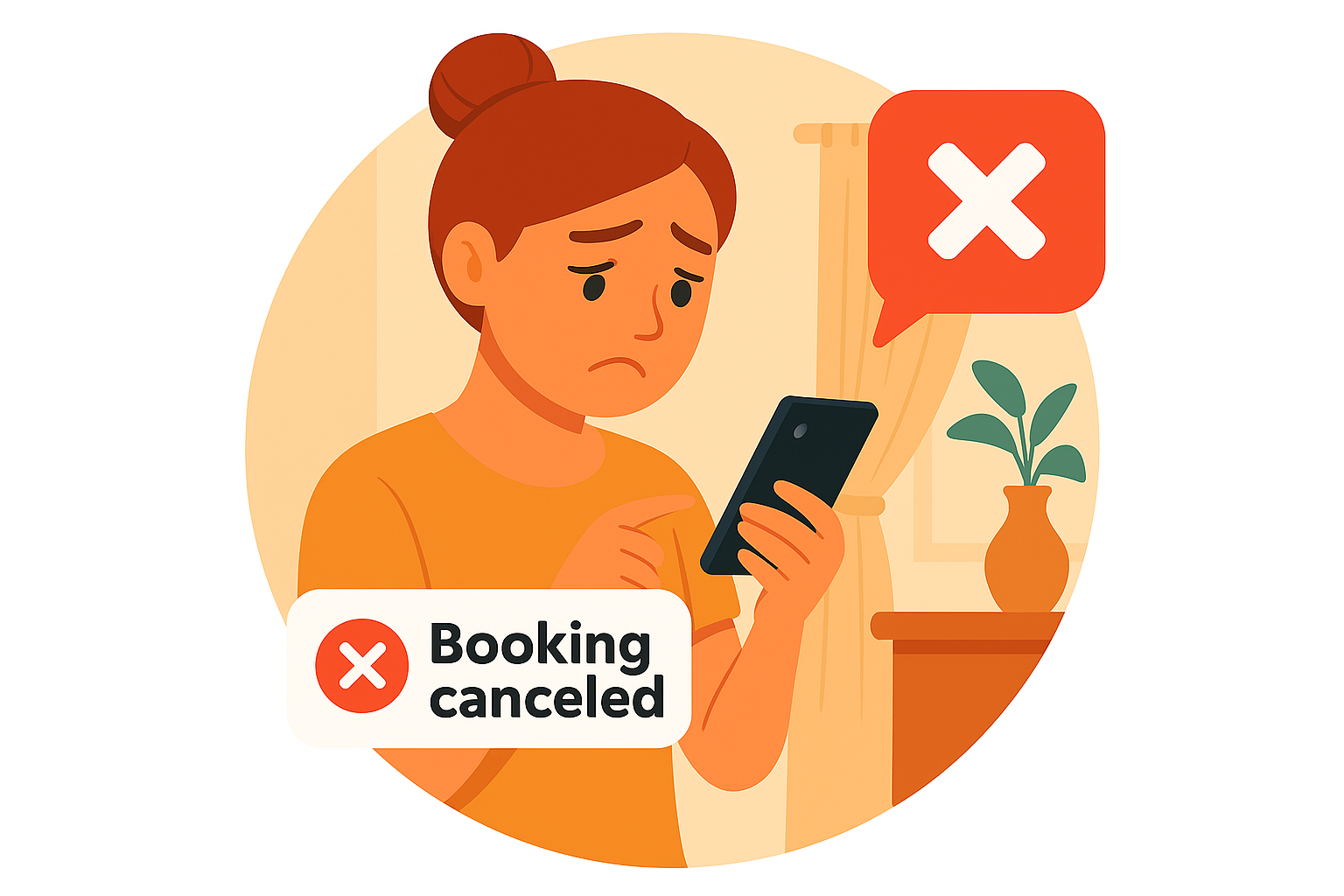 /Collection: /by davooda/Type: PNG/A digital illustration depicting a concerned individual looking at a smartphone with a booking cancellation message, suitable for travel or service-related content.