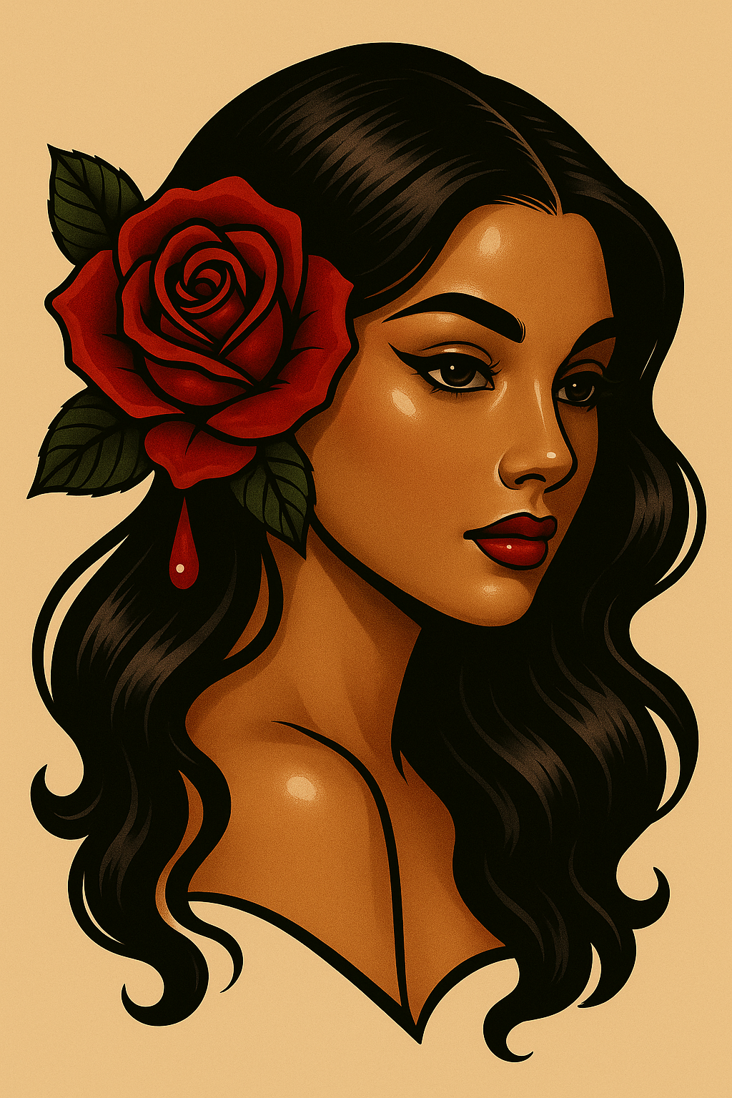 /Collection: /by davooda/Type: PNG/A striking illustration of a woman with long, flowing black hair, adorned with a red rose that has a drop of blood. The background is a soft beige, enhancing the vivid colors.