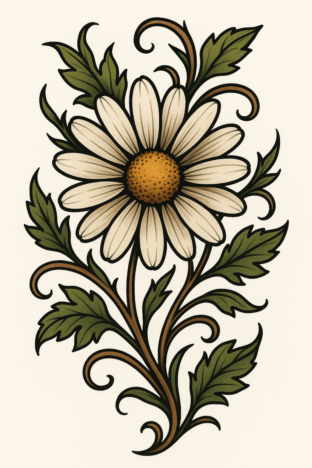 A beautifully detailed illustration of a daisy flower with intricate leafy vines, ideal for botanical art enthusiasts and nature-themed projects.