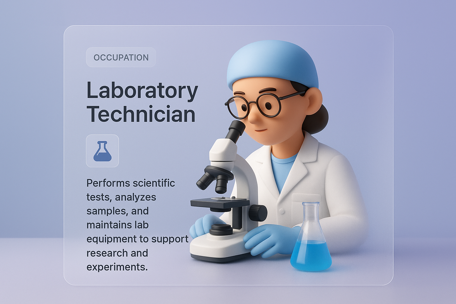 A vibrant 3D illustration of a laboratory technician using a microscope. The background features a smooth gradient, enhancing the focus on the technician and the lab equipment.