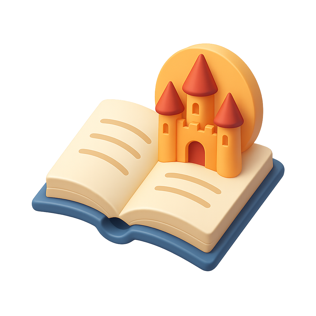 A charming 3D icon featuring an open book with a castle and sun in the background, designed in a volumetric style with a three-quarter view.