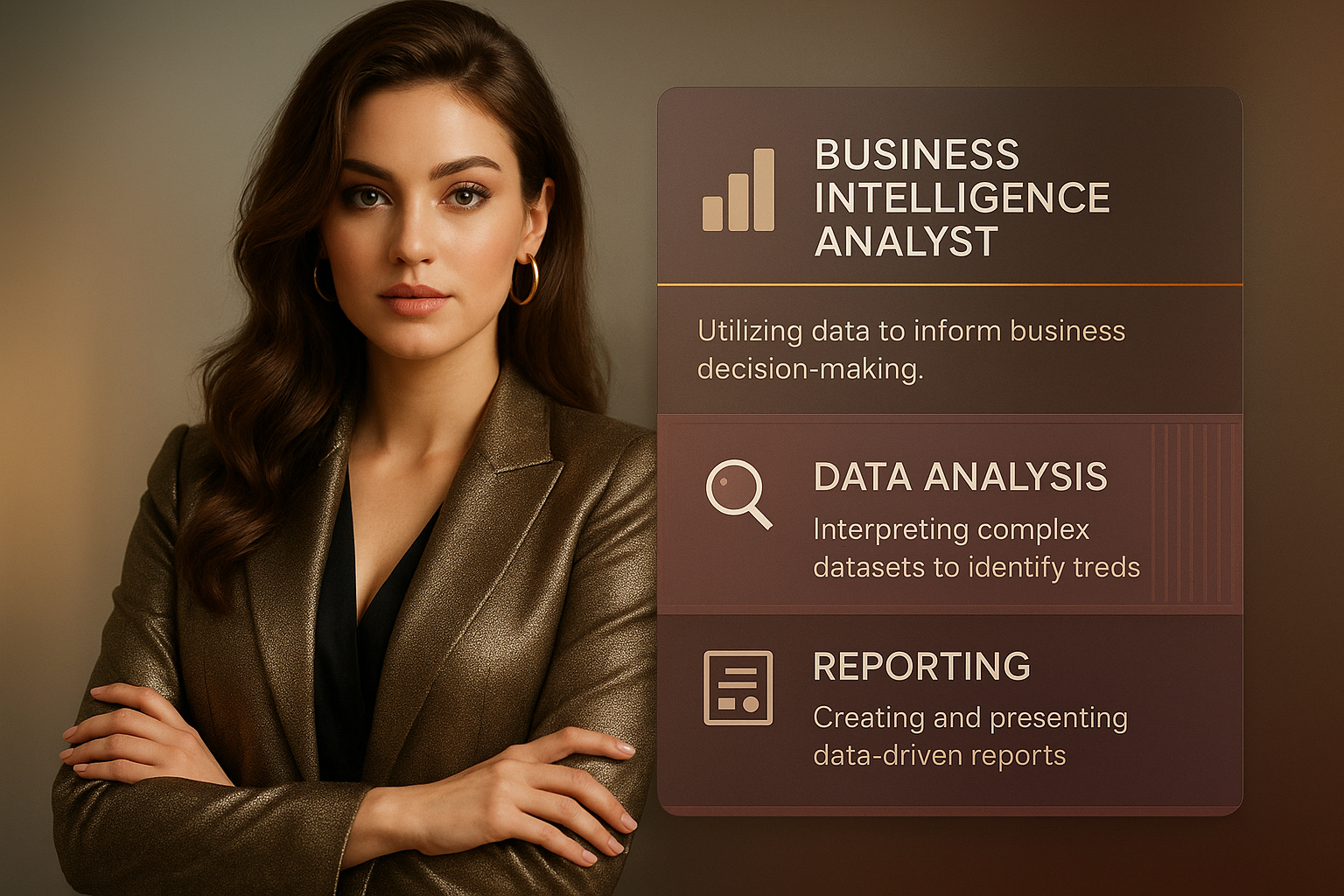 /Collection: /by davooda/Type: PNG/A sleek and glamorous representation of a Business Intelligence Analyst. The image features a professional woman in a stylish outfit and informative blocks detailing key roles like data analysis and reporting.