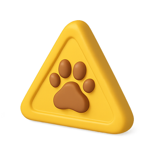 A playful 3D design featuring a yellow triangular warning sign with a brown paw print, suitable for pet-related branding or safety messages.