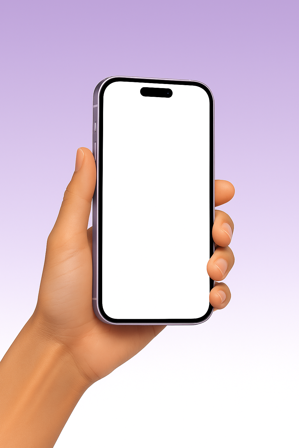 /Collection: /by davooda/Type: PNG/A smartphone is being held in a hand, showcasing a blank screen. The background features a smooth gradient transitioning from light to dark purple, enhancing the focus on the device.