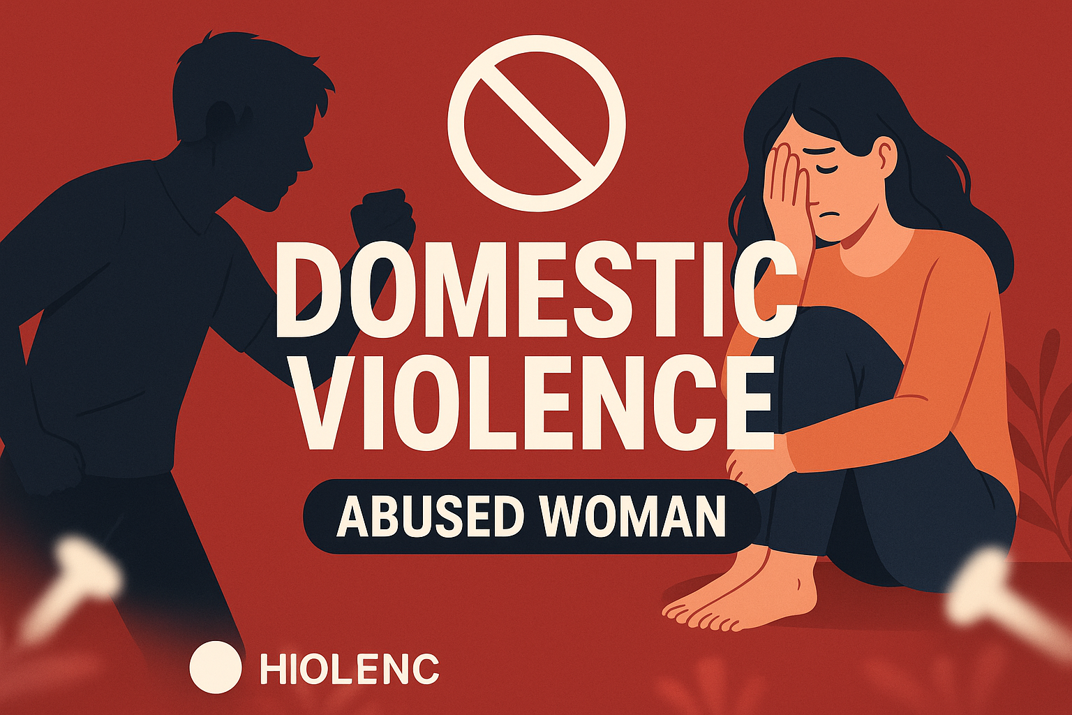 /Collection: /by davooda/Type: PNG/Illustrative graphic addressing domestic violence, featuring a distressed woman and a silhouette of an aggressor, designed for awareness campaigns and educational materials.