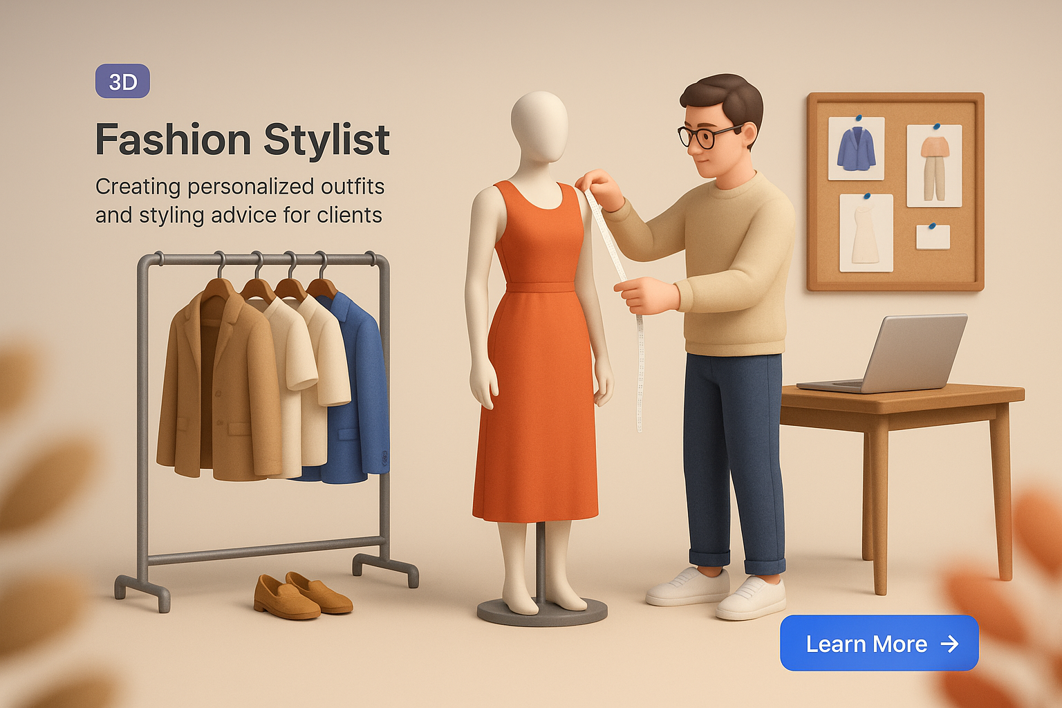 /Collection: /by davooda/Type: PNG/A detailed 3D illustration depicting a fashion stylist adjusting a dress on a mannequin. The scene includes a clothing rack, a laptop, and design sketches on the wall, emphasizing a creative workspace.