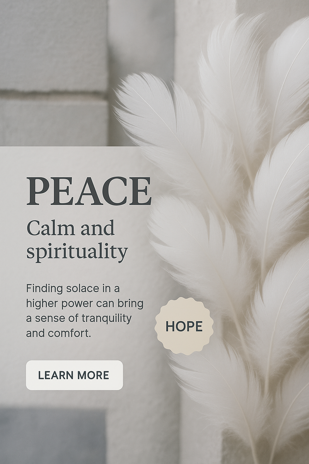 /Collection: /by davooda/Type: PNG/A closeup image featuring soft white feathers against a serene background, symbolizing peace and spirituality. The design includes text elements promoting hope and tranquility.