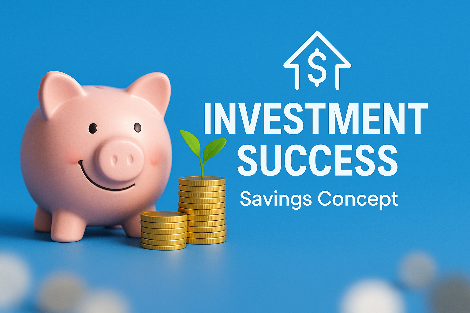 /Collection: /by davooda/Type: PNG/A visually appealing graphic showcasing a piggy bank alongside stacks of coins and a plant, symbolizing investment success and savings. Ideal for financial education and marketing.