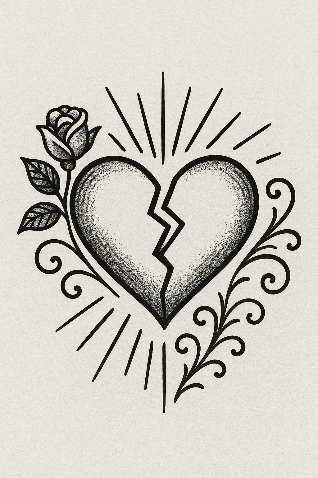 /Collection: /by davooda/Type: PNG/This is a graphic illustration featuring a broken heart surrounded by floral and decorative elements. It combines a vintage style with bold outlines, suitable for tattoo art or emotional artwork.