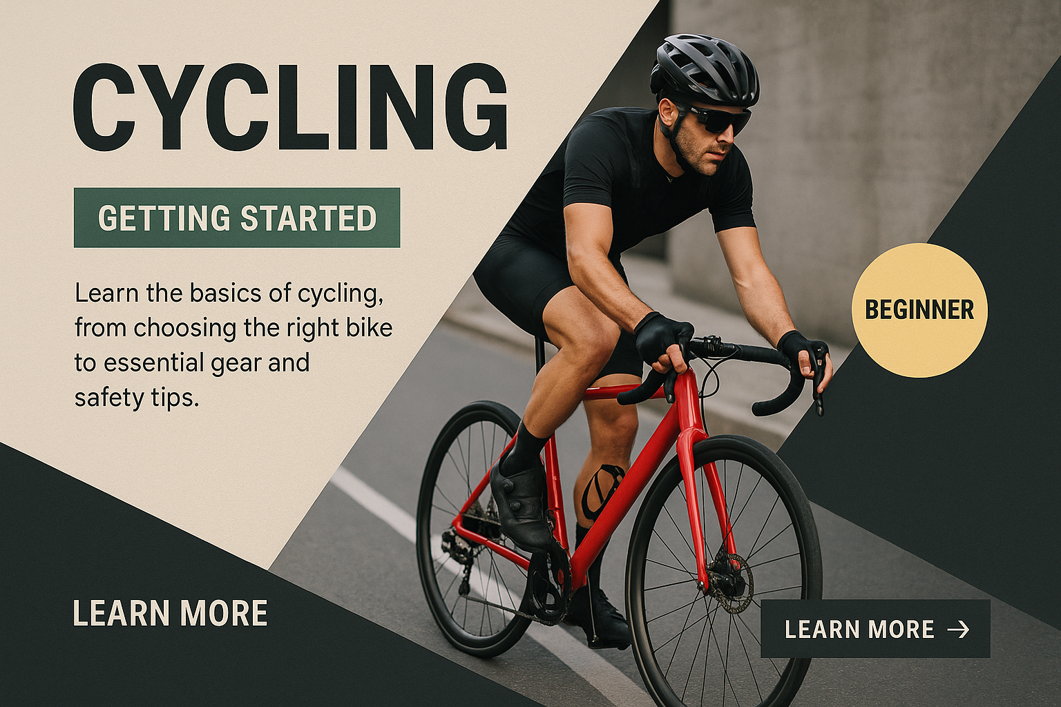 /Collection: /by davooda/Type: PNG/A visually engaging image featuring a cyclist in action, with layered geometric elements and text focused on cycling basics for beginners. The design balances realism with informative content.