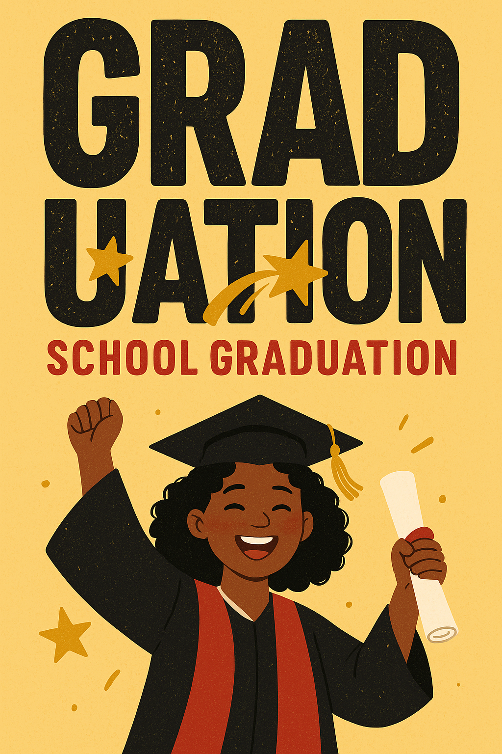 /Collection: /by davooda/Type: PNG/Vibrant and cheerful illustration of a graduate holding a diploma, perfect for school graduation announcements or invitations. The design features bold typography and a warm color palette.