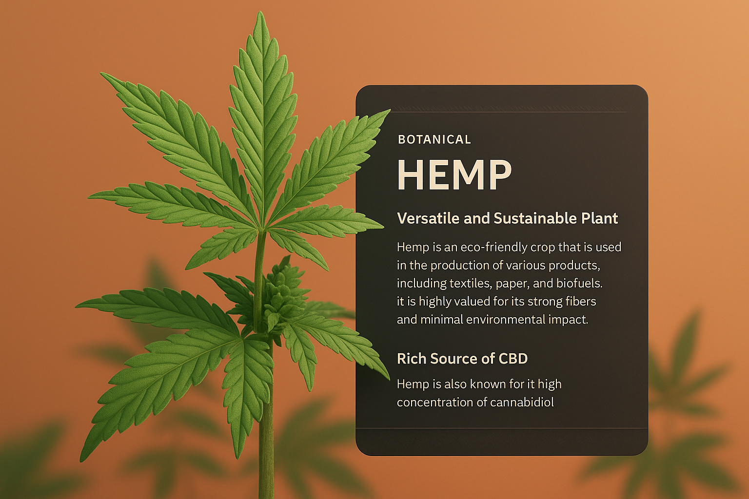 /Collection: /by davooda/Type: PNG/A visually appealing web page design showcasing hemp with a 3D illustration. The layout includes a dark label integrated into the image, featuring a title, graphics, and descriptive text.