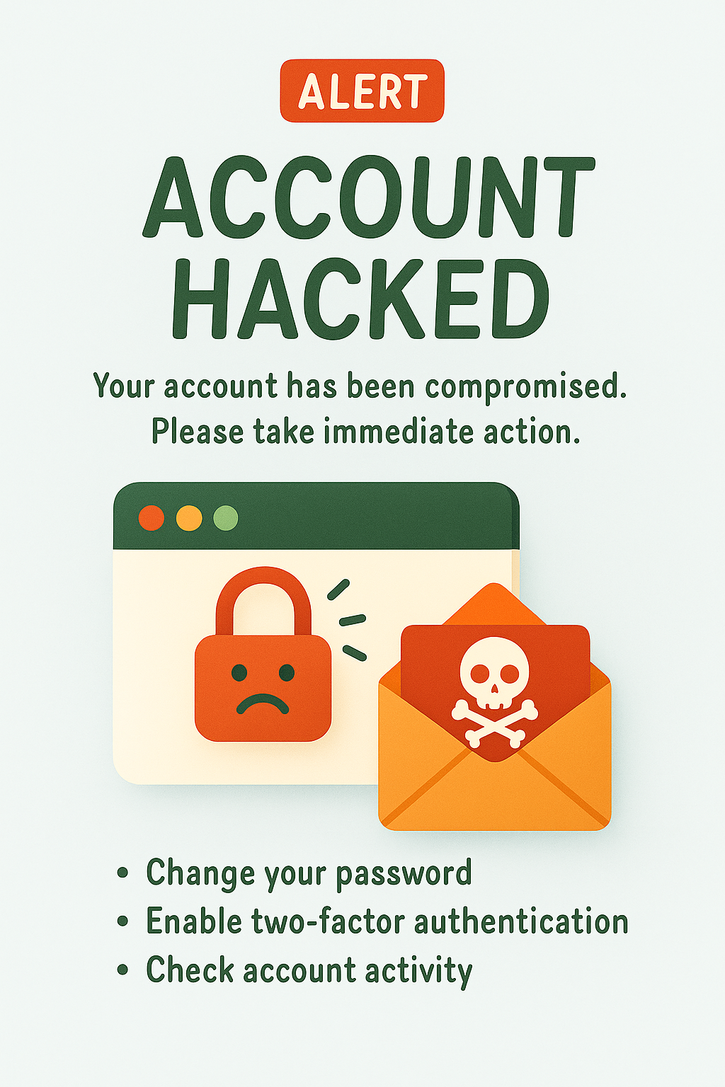 Informative graphic alerting users about a hacked account, featuring a modern design with icons and a clear call to action. Ideal for cybersecurity awareness.