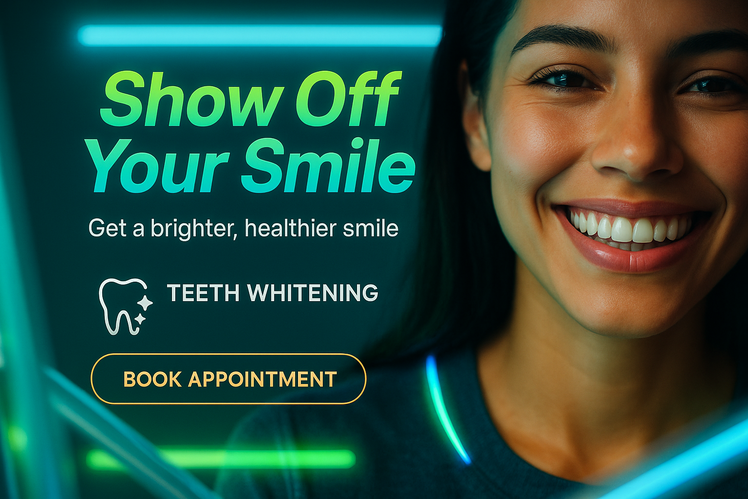 /Collection: /by davooda/Type: PNG/Vibrant promotional banner for teeth whitening services featuring a smiling model, modern design elements, and a call to action for booking appointments, ideal for dental marketing.