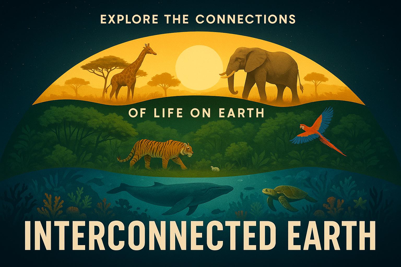 /Collection: /by davooda/Type: PNG/A vibrant illustration showcasing various ecosystems on Earth, featuring animals like a giraffe, elephant, tiger, and whale. The design emphasizes the theme of unity and diversity in nature.