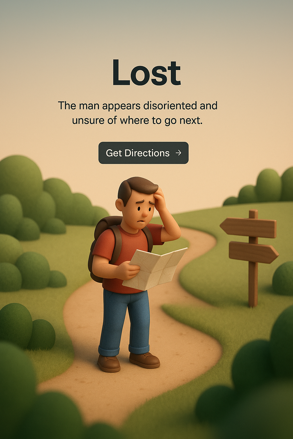 /Collection: /by davooda/Type: PNG/A 3D illustration featuring a disoriented man holding a map, surrounded by a serene landscape. The scene conveys a sense of confusion and the need for direction.