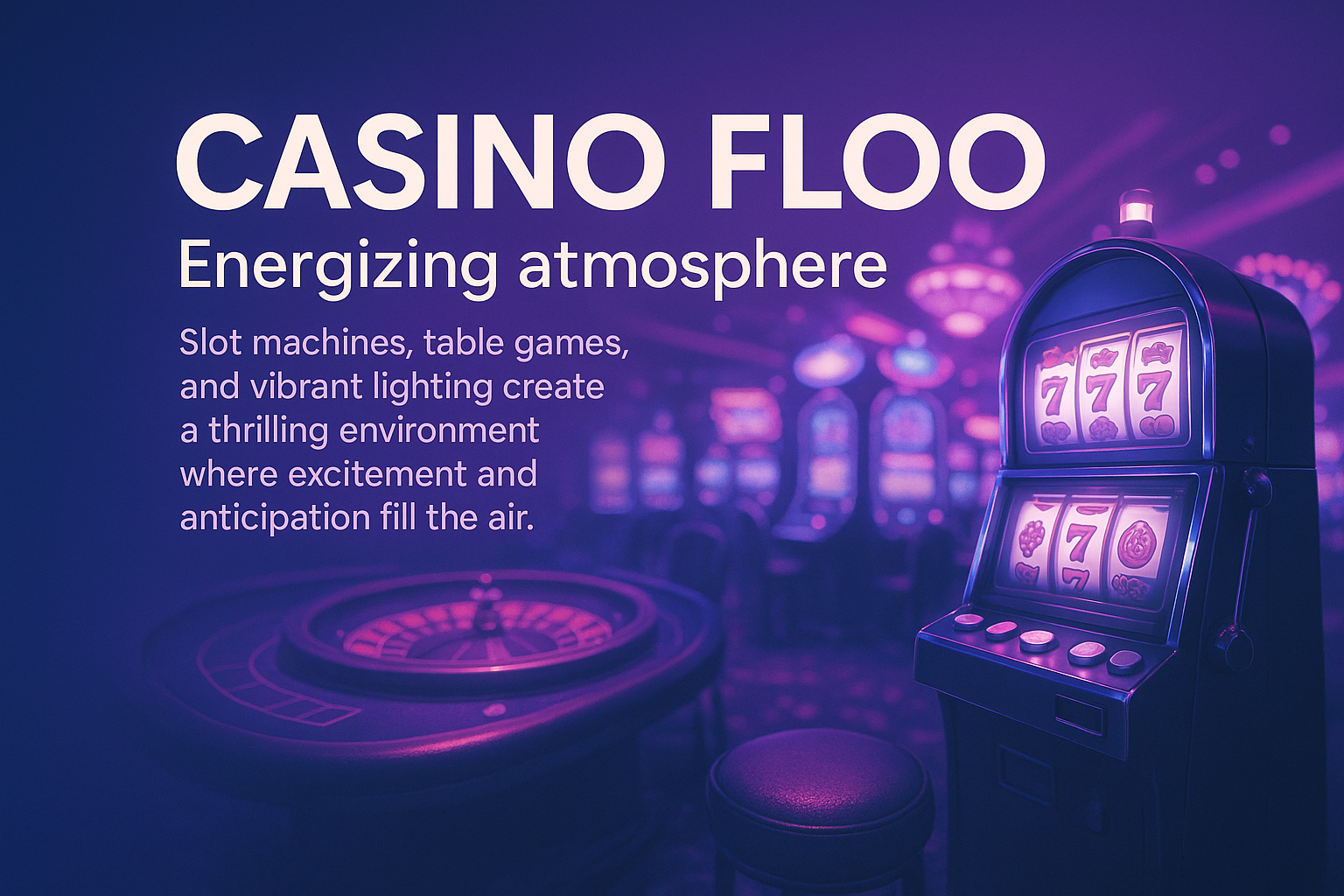 An energetic casino floor showcasing slot machines and vibrant lighting. The design features a layered composition with a gradient background, emphasizing a thrilling environment.