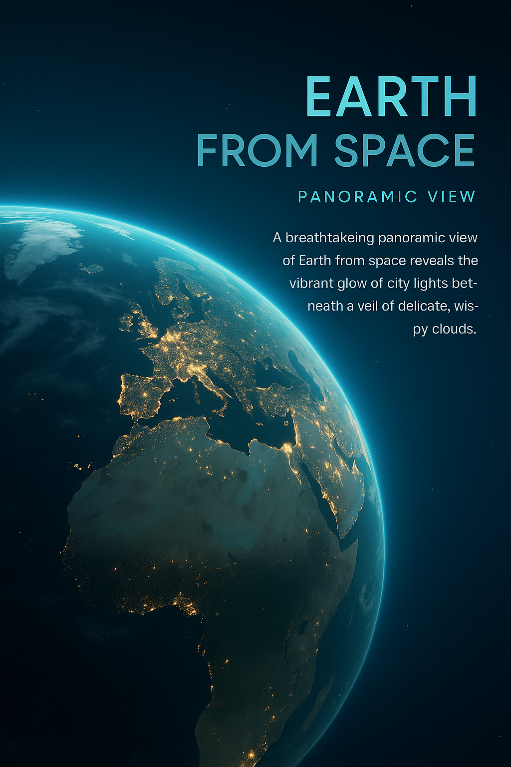A breathtaking panoramic image showcasing Earth illuminated by city lights from space, featuring delicate clouds. Ideal for environmental themes and educational content.