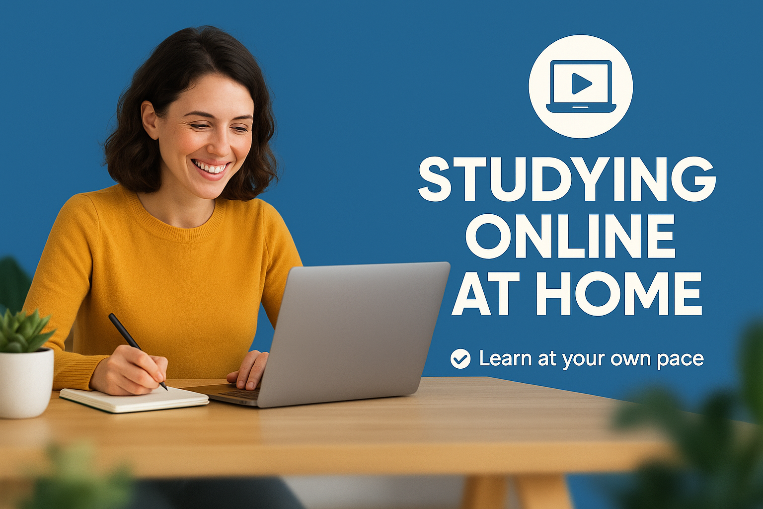A promotional graphic showcasing a woman studying online at home, featuring a modern design and a calming color palette. Ideal for educational platforms targeting remote learners.