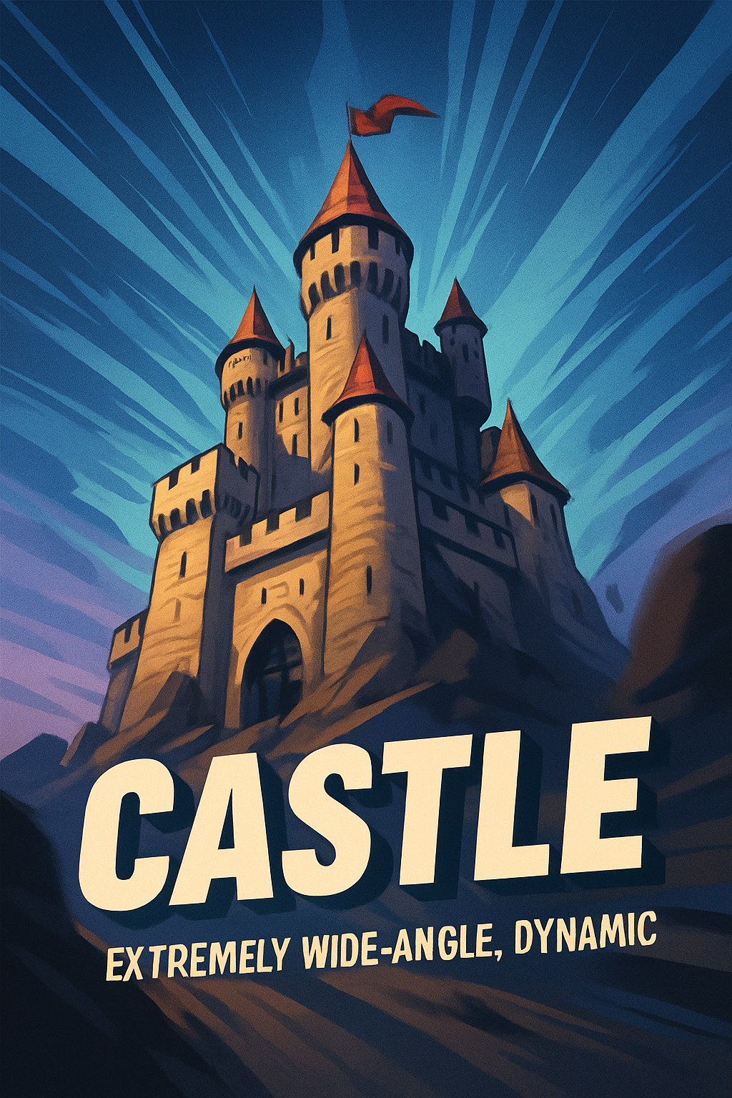 A visually striking illustration of a castle, featuring a bold title. The artwork employs dynamic lines and a smooth gradient background, showcasing a wide-angle perspective.