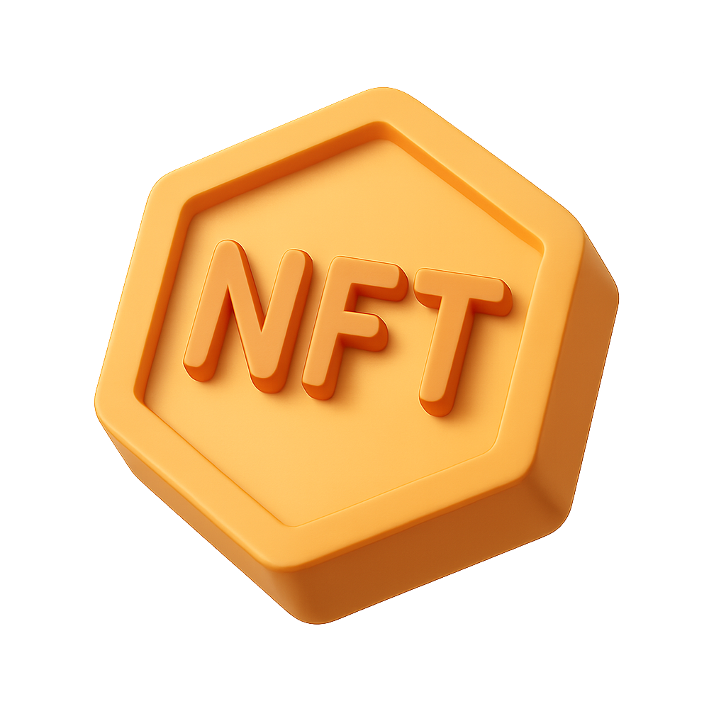 A vibrant 3D icon representing NFTs, featuring a hexagonal shape in bright orange with a glossy finish. The design is isometric and volumetric, set against a gradient backdrop.