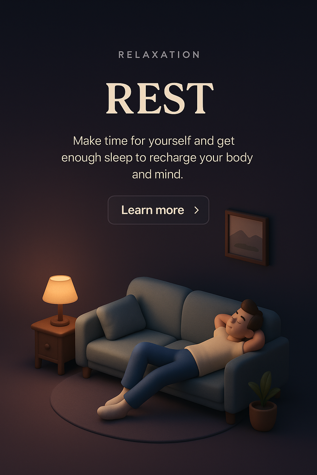 A serene 3D illustration showcasing a person relaxing on a couch in a dark-themed room. The scene captures a cozy atmosphere with soft lighting and calming colors.