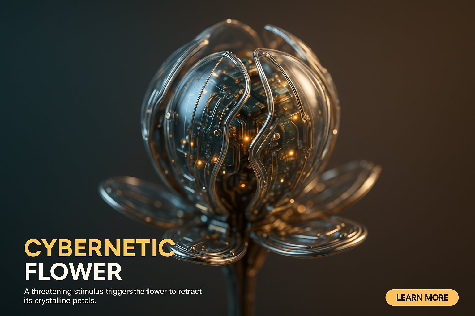 /Collection: /by davooda/Type: PNG/A stunning cybernetic flower showcases intricate, glass-like petals that retract when threatened. The internal design features glowing LEDs and metallic components, captured in extreme close-up.
