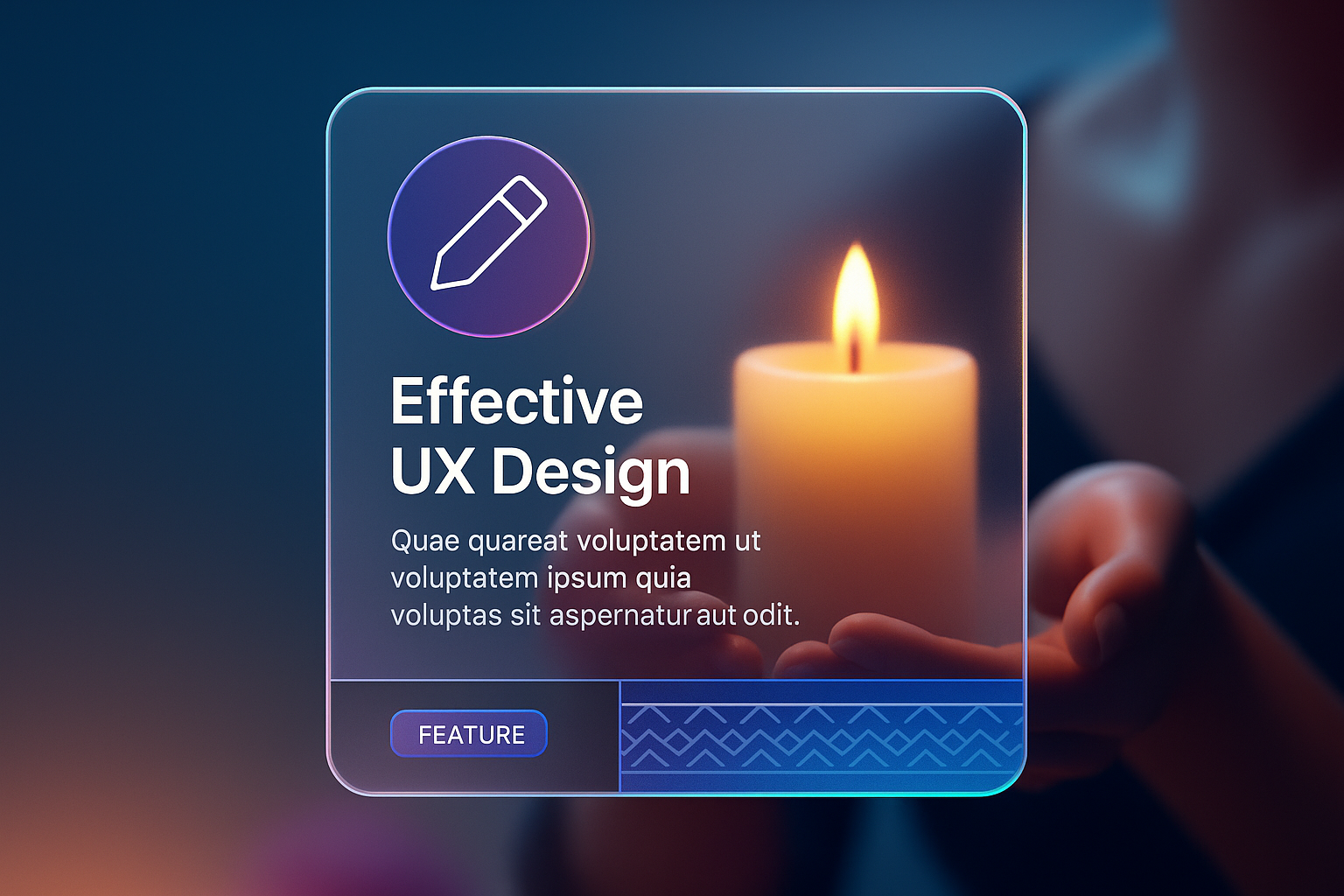 A soft-focus image featuring a burning candle held gently in female hands. The background showcases a gradient that enhances the serene atmosphere, complemented by a stylish information block.